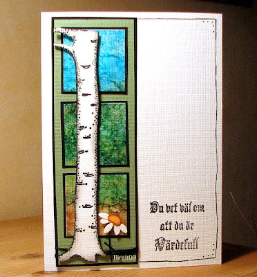 På det andra är trädet Magnolia och kvadraterna gjorda med AlcoInks. Blomman en BossCut die. Texten från Ingers textstämpelark!