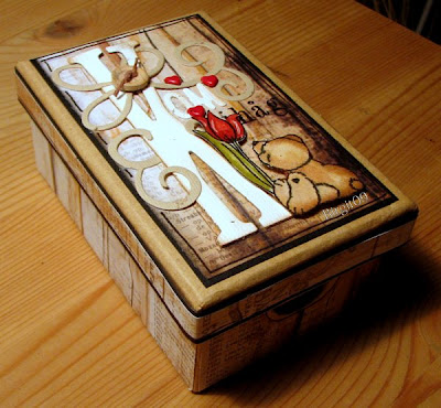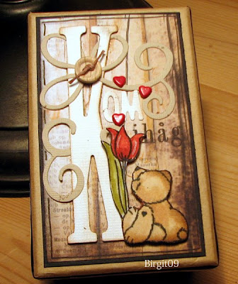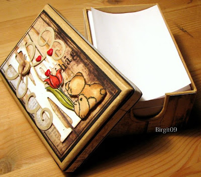 Jag beundrar alla som är duktiga på att altra saker! Önskar jag kunde men jag är ju en mera jordnära typ så jag tänker alltid på hur det ska kunna användas! Det får inte stå ut för mycket... inte vara för ljusa färger så det blir skitigt osv. Så när jag hittade den här asken hos AltheasMix tyckte jag det var perfekt! Den innehåller Kom-ihåg-lappar och det behöver man ju!! :) Sen är jag ju så "förälskad" i det här papperet så det blev ett självklart val! Swirlen är en BossCut die och den söta nallen (med tatueringen :) kommer från Bildmålarna och de finns hos Mita på AltheasMix! Tycker själv att den blev ganska mysig, eller..är jag okritisk kanske?!