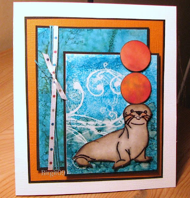På det översta är bakgrunden gjord med AlcoInks på OH-papper. Swirlen från Reprint och ett sjölejon som är en BossCut die, allt från AltheasMIX !